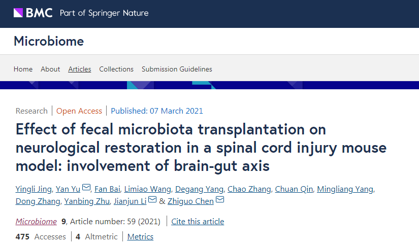 2021年3月7日,18luck下载李建军教授团队在国际著名微生物期刊《microbiome》(2020年影响因子11.607)发表题为《Effect of fecal microbiota transplantation on neurological restoration in a spinal cord injury mouse model: involvement of brain-gut axis》的研究论文。研究团队发现,粪菌移植(fecal microbiota transplantation,FMT)可以重塑肠道微生物,改善脊髓损伤(Spinal Cord Injury, SCI)小鼠肠道功能和神经功能,为临床脊髓损伤的治疗提供了全新的治疗思路。该工作主要由18luck下载康复医学所团队完成,18luck下载李建军教授,于艳所长和宣武医院陈志国教授为共同通讯作者,18luck下载荆瀛黎和白帆为并列第一作者。这是18luck下载首次作为第一作者和通讯作者在该期刊上发表论文。