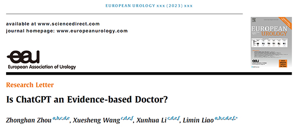 引用文献: Zhou Zhonghan, Wang Xuesheng, Li Xunhua, Liao Limin. Is CHATGPT an Evidence-based Doctor?, European Urology (2023). https:/doi.org10.1016eururo.2023.03.037
