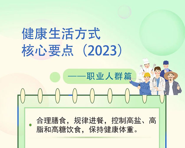 健康生活方式是指个体或群体为实现全生命周期的最佳健康目标而采取的行为模式。近日,全民健康生活方式行动国家行动办公室围绕孕妇、乳母、婴幼儿、儿童青少年、老年人及职业人群存在的健康问题,制定了《健康生活方式核心要点(2023)》,从合理饮食、规律运动、戒烟限酒、心理平衡、良好睡眠、积极社交、主动学习等方面对不同人群的健康生活方式给出了精准指导,引导各类人群积极践行文明健康的生活方式,推动“做自己健康第一责任人”理念的落实。