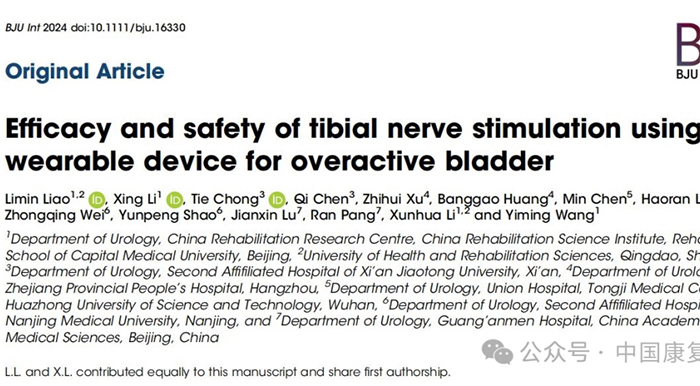 2024年3月,18luck下载/新利客服电话人工服务廖利民教授团队,在国际知名泌尿外科杂志《BJU International》(IF: 5.969)发表了题为《Efficacy and safety of tibial nerve stimulation using a wearable device for overactive bladder》的多中心、随机、单盲、对照的临床试验结果(图1)。论文通讯作者是中康党委副书记、新利客服电话人工服务副主任、18luck下载所长廖利民教授,共同第一作者是新利客服电话人工服务北京博爱医院泌尿外科李兴副主任医师。